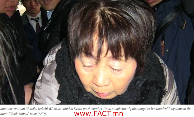 Японы цагдаагийн ажилтнууд олон удаа гэрлэсэн “Хар өвөртэй” нэгэн эмэгтэйг сэжиглэн баривчилжээ. Тэд өдгөө 67 настай Чисако Какехийг гэр бүл болж байсан зургаан нөхрийнхөө үхэлд буруутай гэж үзсэн байна. Цагдаагийн албан хаагчид Чисако Какехийг нөхрүүдийнхээ даатгалын мөнгийг авахын тулд хөнөөсөн гэж сэжиглэж байгаа аж. Одоогоор бэлэвсэн эмэгтэй хуучин нөхрүүдийнхээ даатгалаас 800 сяа иен буюу 6,8 сая доллар олжээ.