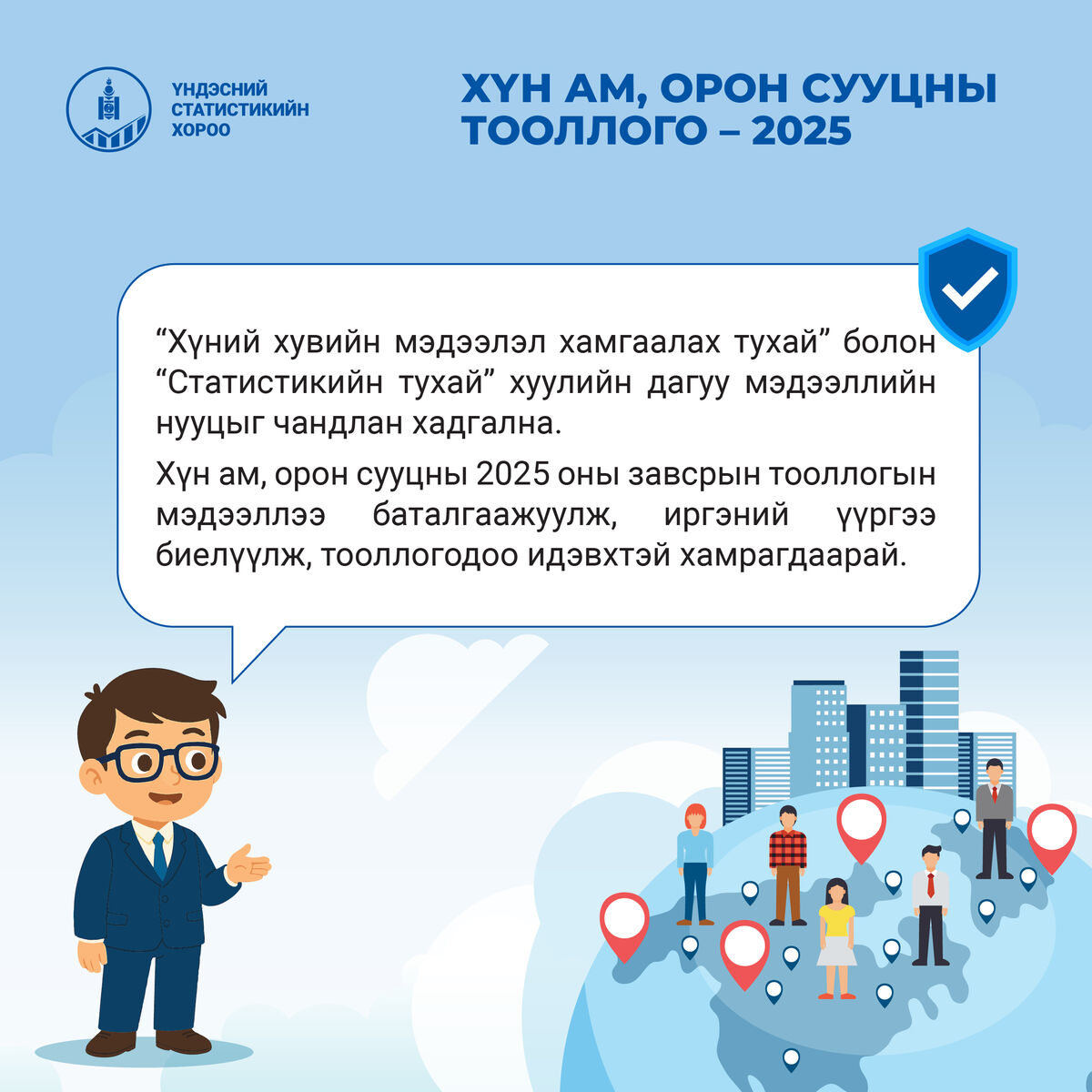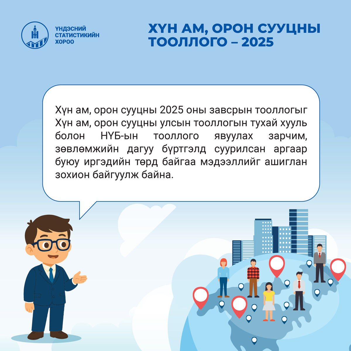 Харин Монгол Улсын улсдаа оршин сууж байгаа иргэн та https://2025.mn холбоосоор хандаж, ДАН системээр нэвтэрч Хүн ам, орон сууцны завсрын тооллогодоо хамрагдах боломжтой.