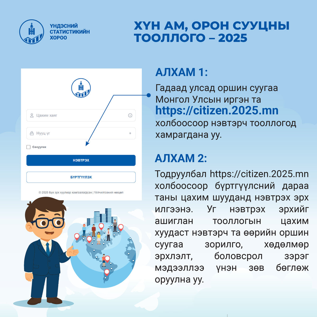 Гадаад улсад оршин суугаа Монгол Улсын иргэн та http://citizen.2025.mn холбоосоор нэвтэрч Хүн ам, орон сууцны 2025 оны завсрын тооллогодоо хамрагдаарай.