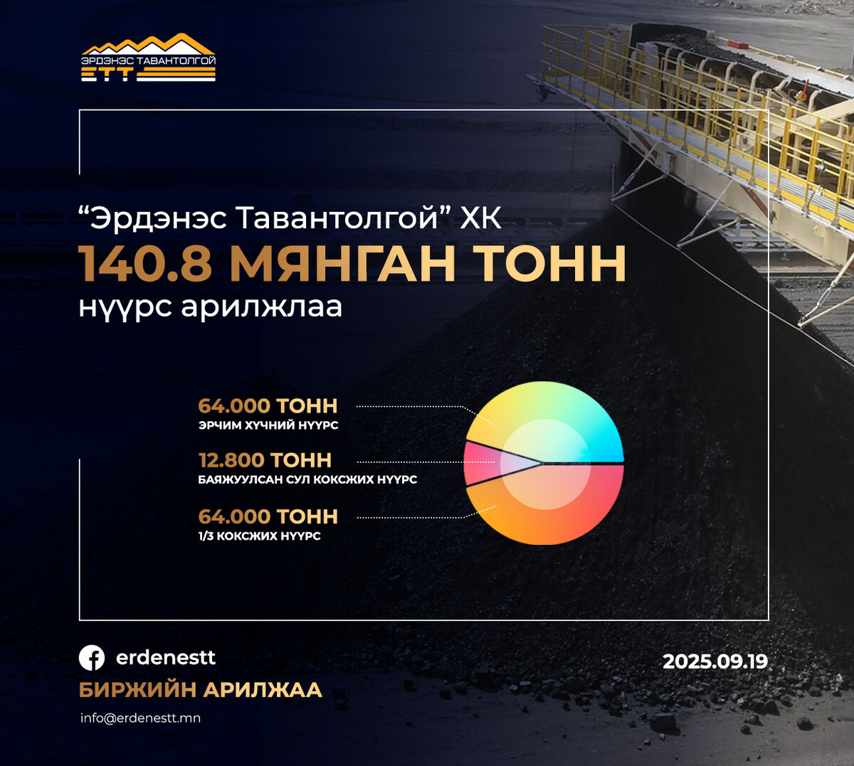 "Эрдэнэс Тавантолгой" ХК 2025 оны 9 дүгээр сарын 19-ний өдөр Монголын Хөрөнгийн Биржээр дамжуулан 3 удаагийн арилжааг амжилттай хийж 2.66 сая ам.долларын үнийн дүн бүхий 64,000 мянган тонн эрчим хүчний нүүрс, 1.16 сая ам.долларын үнэлгээ бүхий 12,800 мянган тонн Баяжуулсан сул коксжих нүүрс, 4.4 сая ам.долларын үнэлгээ бүхий 64,000 мянган тонн 1/3 коксжих нүүрс борлууллаа.