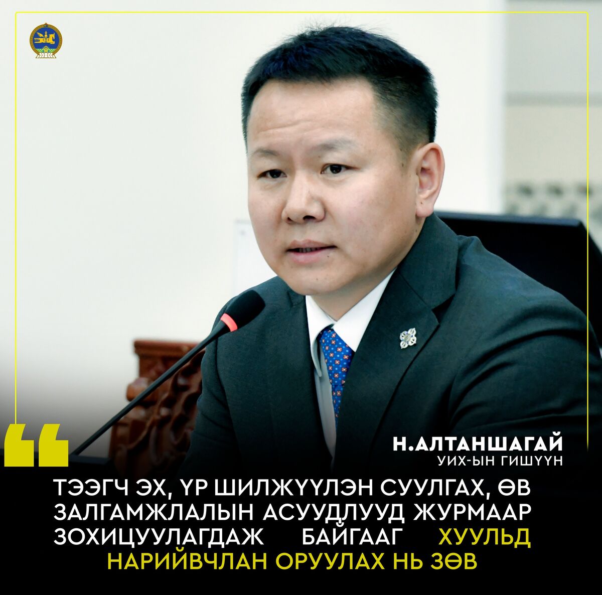 Энэ үеэр УИХ-ын гишүүн Н.Алтаншагай "Гэр бүлийн тухай хууль шинэчлэгдээд орж ирж байна. 1999 онд батлагдсан хууль, найман удаагийн шинэчлэлт, өөрчлөлт хийгдсэн гэж байгаа боловч салбарын харилцааг зохицуулсан буюу бусад хуулийн шинэчлэлийг даган өөрчлөлт оруулсан байдаг. Энэ хуульдаа УИХ таван удаагийн парламентаар ажлын хэсэг байгуулагдаад гар дүрж, өөрчлөлт хийж чадаагүй. Өнөөдөр орж ирж байгаад баяртай байна. Нийгэмд шинээр бий болж байгаа зарим харилцаа, асуудал сүүлийн үед нэлээн хүчтэй яригдах болсон.