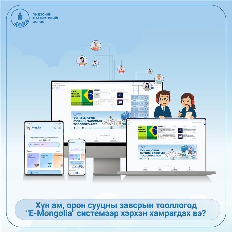 Монгол Улсад хүн ам, орон сууцны завсрын тооллого 2025 онд бүртгэлд суурилсан аргаар зохион байгуулагдаж байна. Энэхүү тооллого нь хүн амын нийгэм, эдийн засгийн байдал, хөдөлмөр эрхлэлт, боловсрол, шилжилт хөдөлгөөн, орон сууцны төрөл, нөхцөл зэрэг гол үзүүлэлтийг бүртгэх, дүн шинжилгээ хийх зорилготой цогц судалгаа юм. Монгол Улсын Статистикийн хорооноос хүн ам, орон сууцны тооллогыг холбогдох хууль, олон улсын зарчим, зөвлөмжид нийцүүлэн төрийн 15 байгууллагын суурь болон төрөлжсөн мэдээллийн санг ашиглан зохион байгуулж байгаа юм. Иргэд “Хүн ам, орон сууцны тооллого–2025” судалгаанд “E-Mongolia “ портал болон мобайл аппликэйшн-ээр дамжуулан оролцох боломжтойг дахин анхааруулъя. Хэрэглэгч “E-Mongolia”-д нэвтэрсний дараа эхний нүүрэнд байрлах баннер дээр дарснаар “2025.mn” цахим хуудсанд автоматаар холбогдож, судалгааг бөглөх нөхцөл бүрдэнэ.