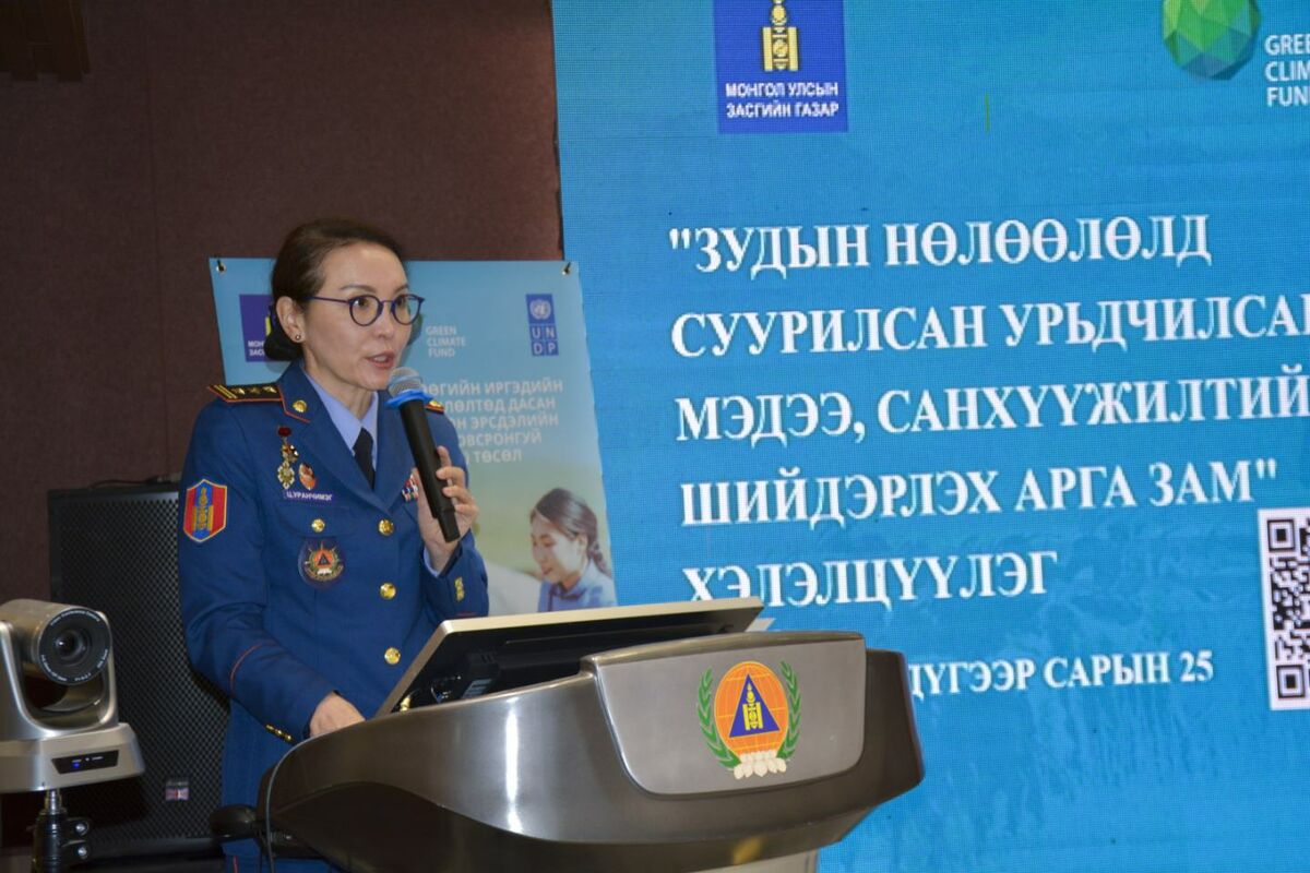 Хурандаа Ц.Уранчимэг хэлсэн үгэндээ “МУЗН-ээс цаг уурын мэдээлэлд суурилсан санхүүжилтийн (Forecast-based financing) механизмыг хэрэгжүүлж эхэлсэн нь эрсдэлийг урьдчилан тооцож, хүндрэхээс өмнө малчдад шаардлагатай дэмжлэгийг цаг тухайд нь хүргэж урьдчилан хамгаалах тогтолцоонд тодорхой хувь нэмэр болж байна. Энэхүү улсын болон дотоодын туршлага нь зудын давтамж, эрчим нэмэгдэж байгаа өнөөгийн нөхцөлд төрийн байгууллагууд бодлого, төлөвлөлтдөө тусгаж, салбар хоорондын уялдаа холбоо дэмжлэгтэйгээр хэрэгжүүлэх шаардлагатай байна. Тиймээс зудын эрсдэлийг эрт илрүүлэх чадавхыг улам бэхжүүлэх, төрийн байгууллагууд болон олон улсын байгууллага хоорондын мэдээлэл солилцоо, уялдаа холбооны урсгалыг сайжруулах, улмаар даатгалын механизм болон эрт санхүүжилтийн тогтолцоог бүрдүүлж, гамшгийн эрсдэлийг бууруулах бодлогыг үр нөлөөтэй хэрэгжүүлэхэд энэ удаагийн хэлэлцүүлэг хувь нэмэр оруулна гэдэгт итгэлтэй байна” гэлээ.
