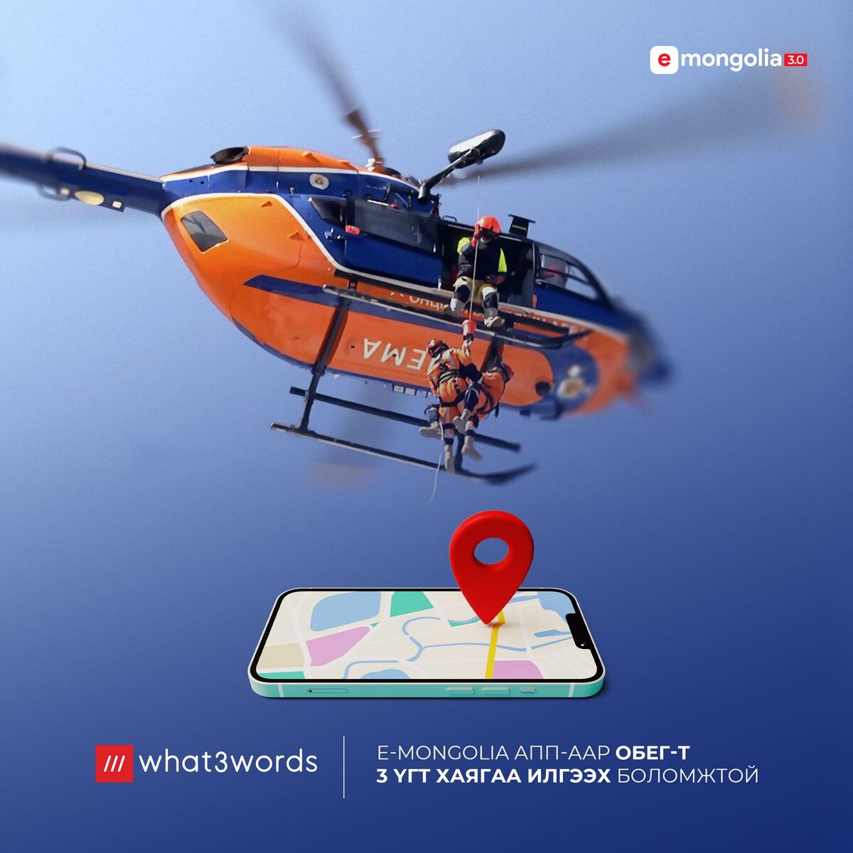 Онцгой байдлын байгууллага нь “what3words” программыг ашиглан, аюул, ослын дуудлагыг иргэдээс 3 үгт хаяг буюу what3words апплейкшнаар авч, байршлыг цаг алдалгүй тогтоож, эрлийн ажиллагааг шуурхай зохион байгуулж байна.