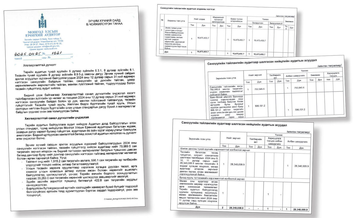 Үндэсний аудитын газраас Эрчим хүчний сайдын эрхлэх асуудлын хүрээний байгууллагуудын санхүүгийн нэгтгэсэн тайлан, төсвийн гүйцэтгэлд аудит хийжээ. 2025 оны байдлаар аудитын шалгалтаар нийт 79.98 тэрбум төгрөгийн 207 зөрчил илэрснээс 189.1 сая төгрөгийн төлбөрийн 45 акт тогтоож, 74.53 тэрбум төгрөгийн 87 албан шаардлага хүргүүлж, 5.2 тэрбум төгрөгийн 75 зөвлөмж өгчээ.
