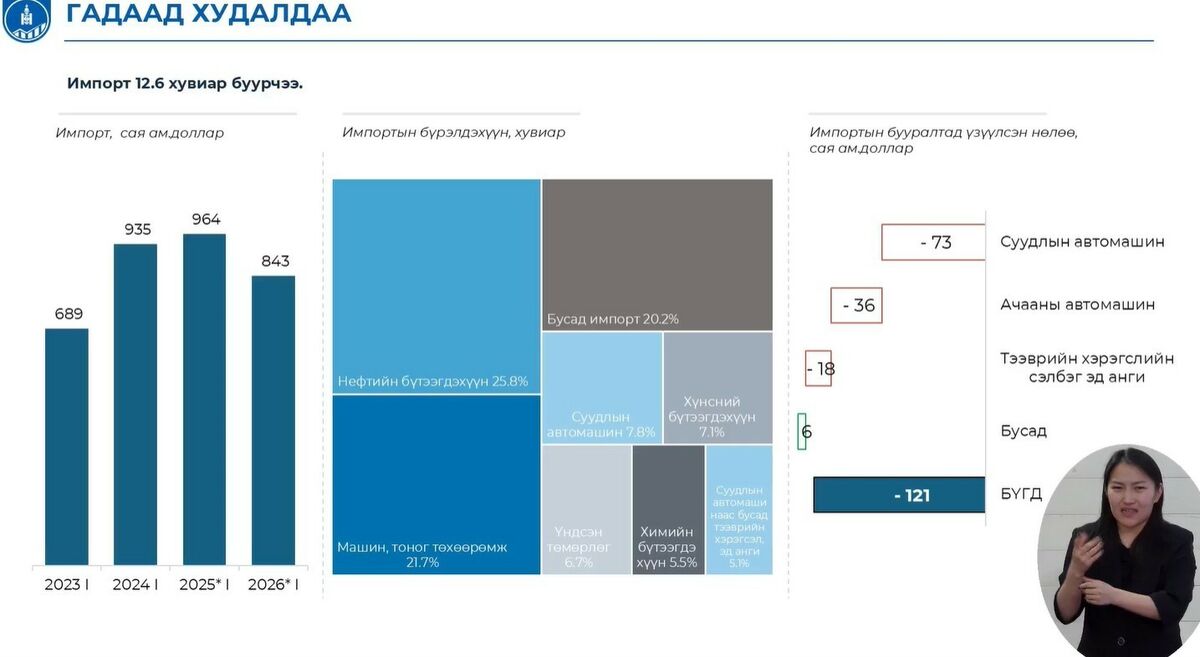 Мөн тээврийн хэрэгслийн сэлбэг эд анги 52.5 сая ам.доллар буюу 69.1 хувиар буурсан нь импорт буурахад голлон нөлөөлсөн гэв.