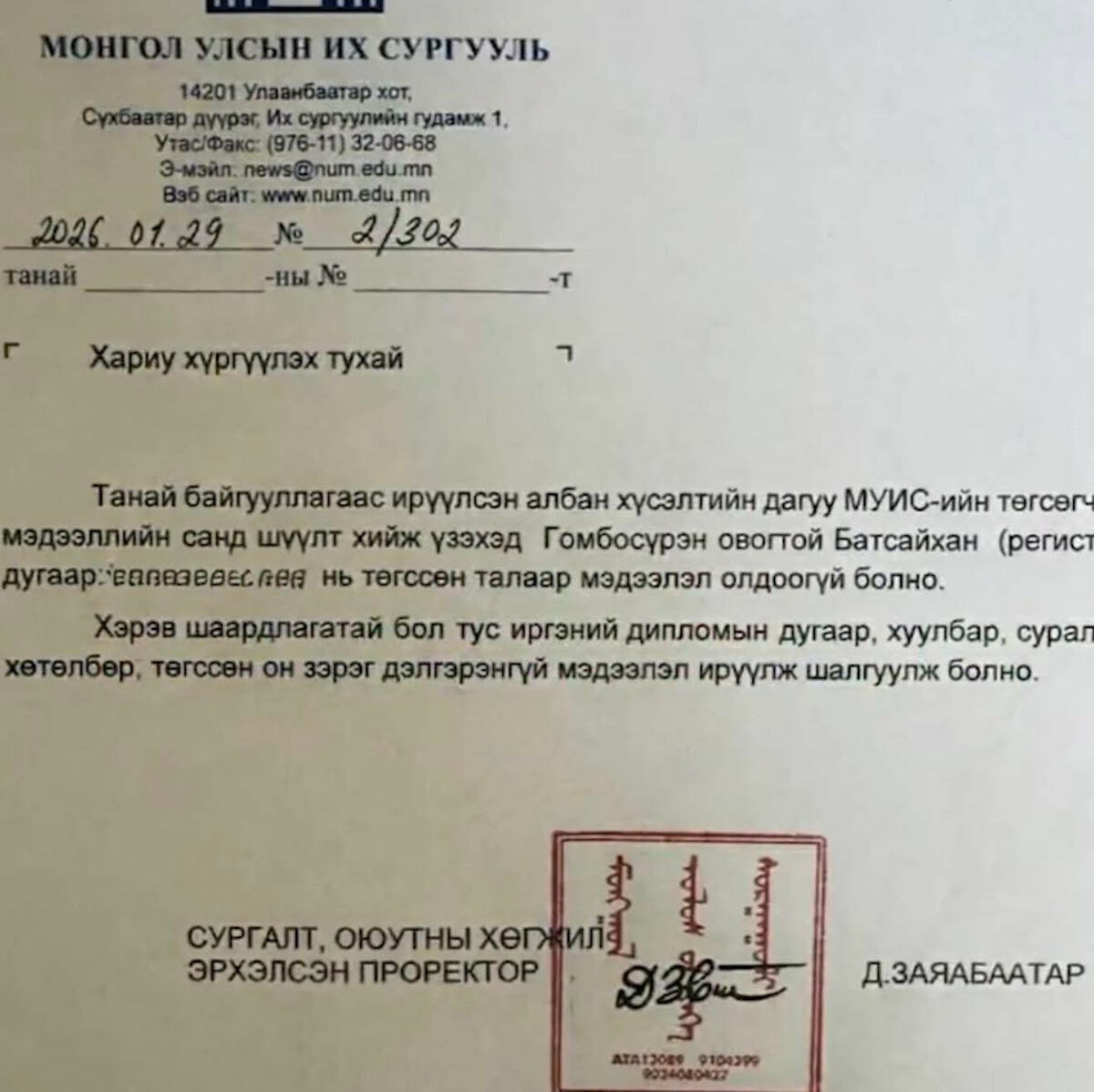 Тодруулбал, МУИС-ийн зүгээс албан хүсэлтийн дагуу төгсөгчдийн мэдээллийн санд шүүлт хийхэд “Гомбосүрэн овогтой Батсайхан нь төгссөн талаарх мэдээлэл олдоогүй болно” гэж мэдэгдсэн байна. Өөрөөр хэлбэл, МУИС-ийн албан ёсны төгсөгчдийн бүртгэлд тухайн иргэн хууль эрхзүйн чиглэлээр суралцаж төгссөн гэх мэдээлэл одоогоор байхгүй гэсэн үг. Мөн тус сургууль шаардлагатай тохиолдолд дипломын дугаар, хуулбар, сурсан хөтөлбөр, төгссөн он зэрэг дэлгэрэнгүй мэдээллийг ирүүлбэл дахин нягталж шалгах боломжтойг дурдсан юм.
