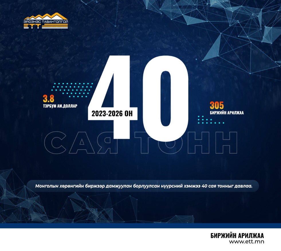"Эрдэнэс Тавантолгой" ХК 2026 оны 03 дугаар сарын 05-ны өдөр Монголын Хөрөнгийн Биржээр дамжуулан 1 удаагийн амжилттай арилжаагаар 64.0 мянган тонн нүүрсийг нийт 3.9 сая ам.долларын үнийн дүнтэйгээр БНХАУ-ын боомт хүргэж өгөх нөхцөлөөр арилжааллаа.