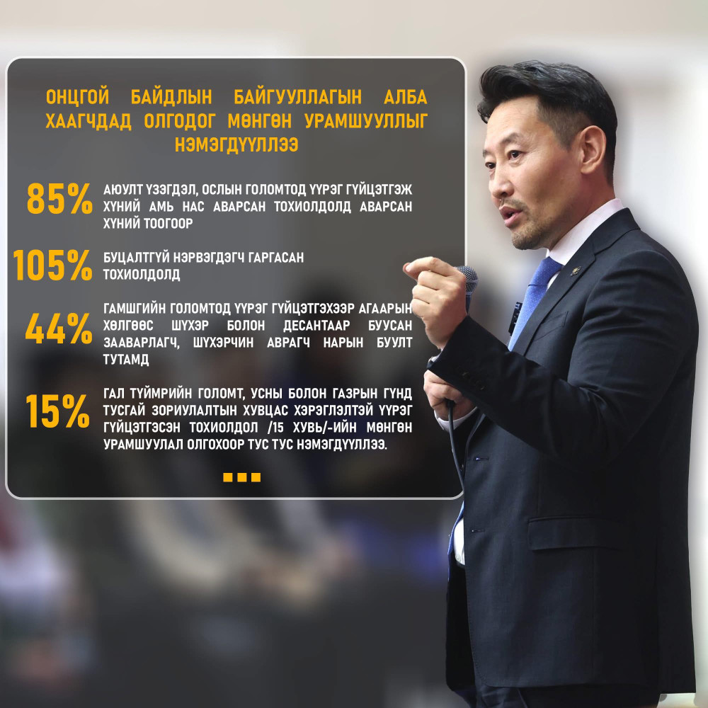 - Гал түймрийн голомт, усны болон газрын гүнд тусгай зориулалтын хувцас хэрэглэлтэй үүрэг гүйцэтгэсэн тохиолдол /15 хувь/-ийн мөнгөн урамшуулал олгохоор тус тус тусгажээ.