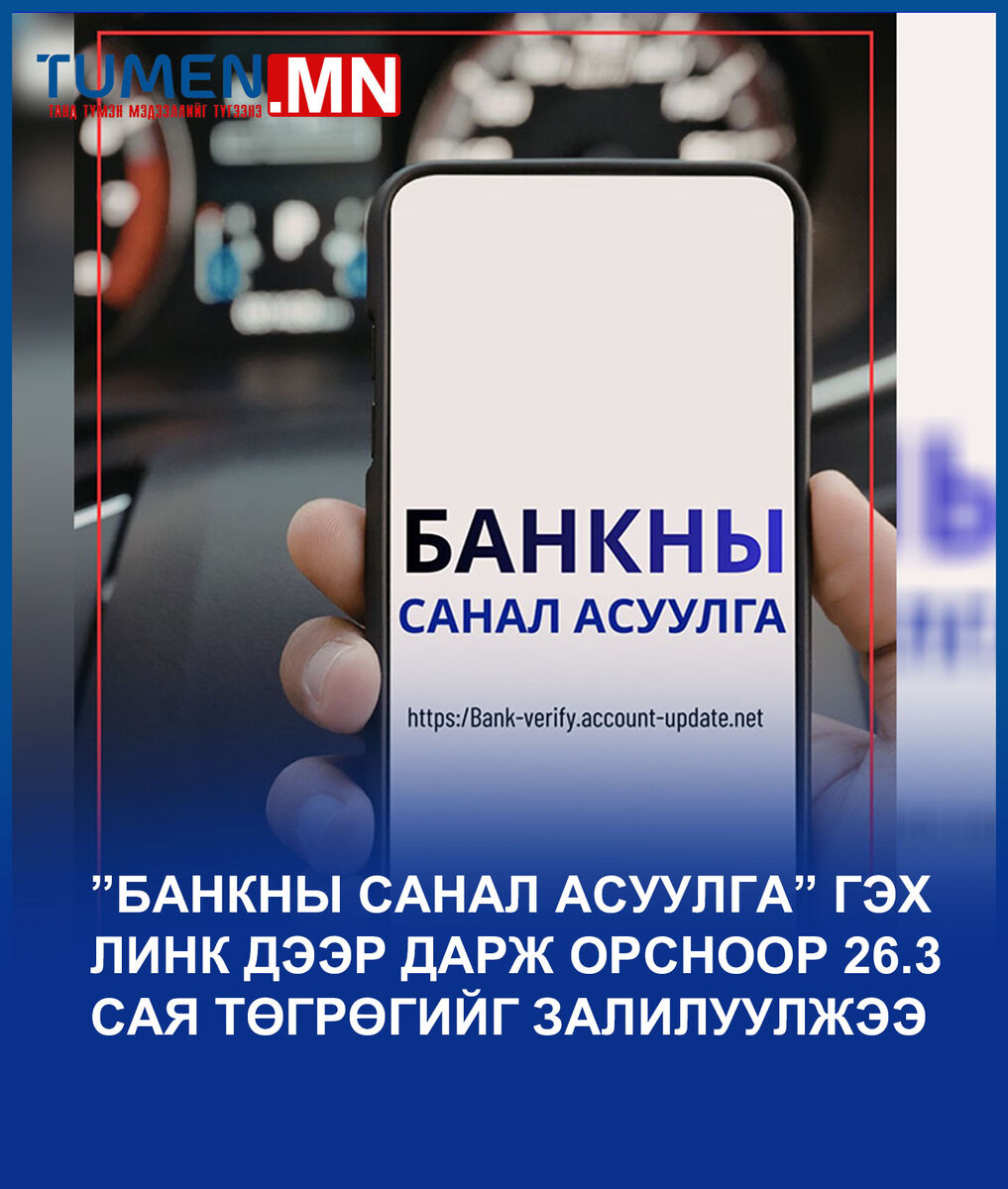 ”Банкны санал асуулга” гэх тодорхойгүй холбоос линк гар утсанд нь ирсний дагуу, тус линк дээр дарж орсноор 26.370.000 төгрөгийг өөрийн данснаас алдсан гэх дуудлага, мэдээлэл Дархан-Уул аймгийн цагдаагийн газарт бүртгэгдэн, шалгалтын ажиллагаа үргэлжилж байна.