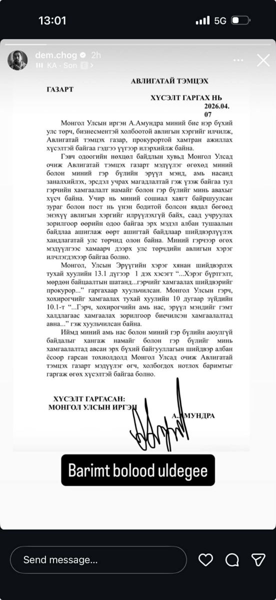 МАН-ын гишүүнчлэлээс хөөгдөөд буй А.Амундра АТГ-т хүсэлт гаргажээ. Тэрбээр өдгөө эх орондоо байхгүй ч өөрийн инстаграмаараа дамжуулан гэмт хэргийн шинжтэй мэдээллүүдийг дэлгэсээр байгаа юм.