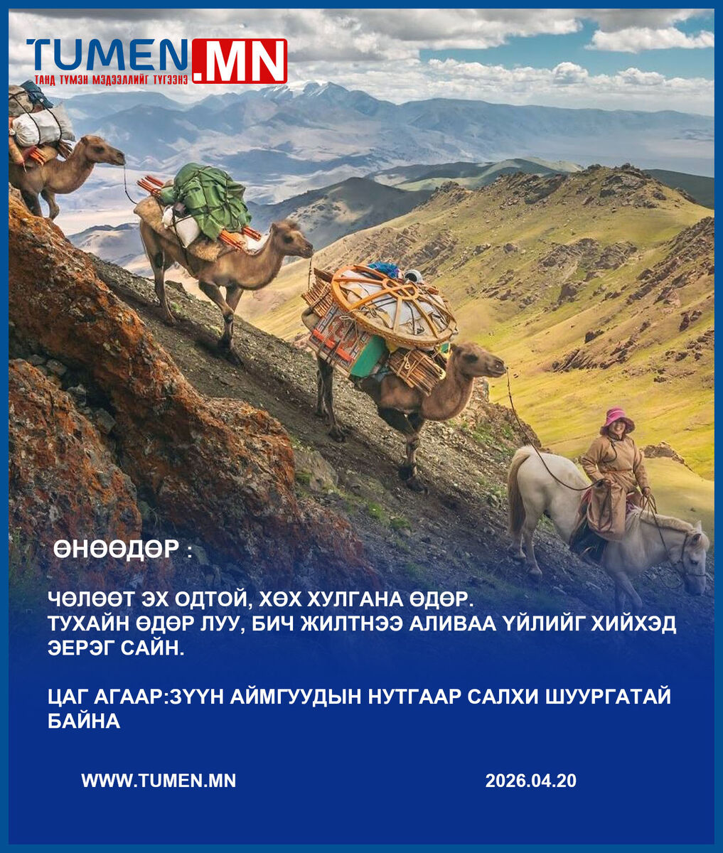 Малчид, иргэд, тээвэрчдийн анхааралд: 20-нд Зүүн аймгуудын нутгаар салхи шуургатай байгаа тул зам даваа гүвээнд халтиргаа гулгаа, мөстөлт үүсэж, үзэгдэх орчин хязгаарлагдах нөхцөл бүрдсэн байгааг онцгойлон анхааруулж байна.